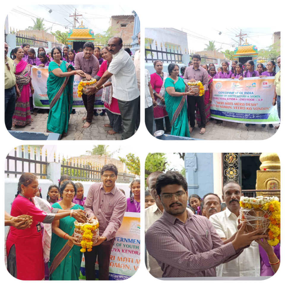 Piler, September 5(Jaanam News): As part of the “Meri Matti Mera Desh” programme, “Matti Ka Naman” program was grandly organized in the premises of the local Sri Kashi Visvesvara temple under the auspices of Chittoor Nehru Yuva Kendra* in collaboration with the local *ZP High (Main) School and ‘SHE’ organization. Soil was collected from the temple premises. Also, handfuls of soil were collected from the houses of the villagers of the village. Nehru Yuva Kendra State (AP and Telangana) Director AR Vijaya Rao, Nehru Yuva Kendra Chittoor District Youth Officer B.Pradeep Kumar were the chief guests of this program.Speaking on the occasion, they said that this campaign is being organized to honor those who sacrificed their lives for the defense of the country.They said that it will be conducted at village, block, district, state and national levels across the country.They said that the collected soil will be laid in the garden of the newly constructed Parliament premises in New Delhi, our capital.They said that the concluding festivities will be celebrated as part of the Azadi Ka Amrit Mahotsav program.As part of the programme, soil donated by the villagers and school management was embedded in an urn. Also “Punch Pran” pledge was taken by all the students.In this program Dr. PVS Lakshmi Sudhakar Rayalu, Head Master of local ZP High (Main) School, R.Surendra Natha Reddy, teacher Reddappa, school students and village people participated.