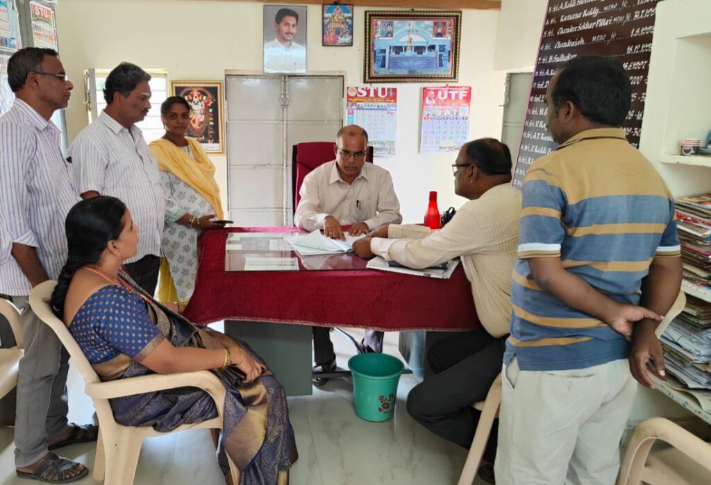 మధ్యాహ్న భోజనాన్ని తనిఖీ చేసి తానే పిల్లలకు వడ్డించి పిల్లలతోపాటు భోజనం తిన్నారు. పాఠశాల సిబ్బందితో సమావేశం ఏర్పాటు చేసి ఉపాధ్యాయులు విధుల్లో నిర్లక్ష్యం వహిస్తే సహించేది లేదని అన్నారు. ఉపాధ్యాయులకు తగు సలహాలు సూచనలు అందజేశారు. అనంతరం మండల విద్యాశాఖ అధికారి కార్యాలయం సందర్శించారు. రికార్డ్స్ పరిశీలించారు. పదవ తరగతి ఫెయిల్ అయిన విద్యార్థులను తిరిగి పాఠశాలలో చేర్పించాలని అన్నారు. నాడు నేడు పనులపై సమీక్ష నిర్వహించారు. సిఆర్పీలు క్షేత్రస్థాయిలో తనిఖీ చేసి “నాడు-నేడు” పనులు,బడి మానేసిన పిల్లల వివరాలు సేకరించాలని ఆదేశించారు.