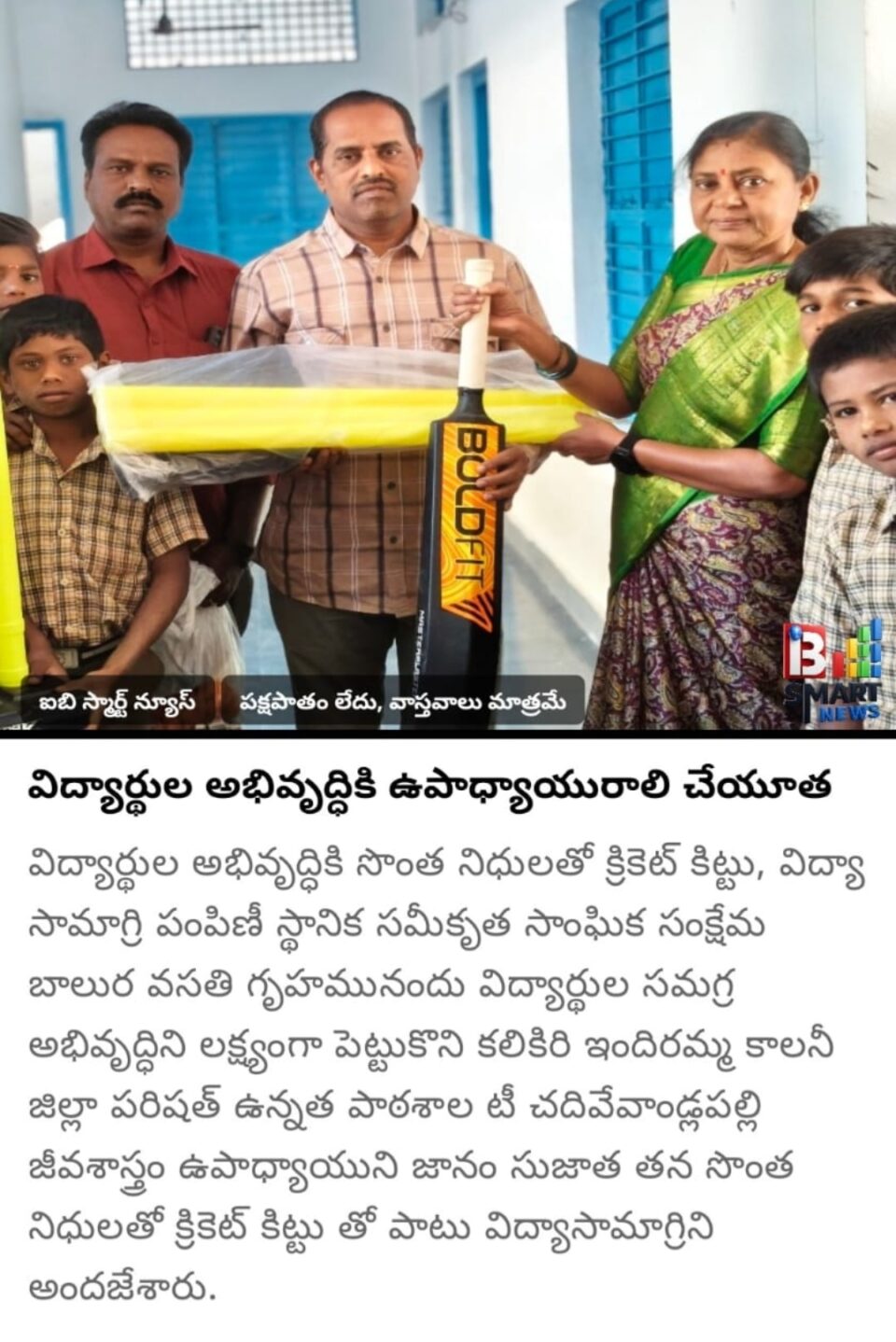 కలికిరి, ఫిబ్రవరి 13(జానం న్యూస్): స్థానిక సమీకృత సాంఘిక సంక్షేమ బాలుర వసతి గృహంలో నివసిస్తున్న విద్యార్థుల అభివృద్ధిని దృష్టిలో ఉంచుకుని, ఇందిరమ్మ కాలనీ జిల్లా పరిషత్ ఉన్నత పాఠశాల (టి. చదివేవాండ్లపల్లి) జీవశాస్త్ర ఉపాధ్యాయిని జానం సుజాత తన స్వంత నిధులతో క్రికెట్ కిట్తో పాటు అవసరమైన విద్యా సామగ్రిని అందజేశారు.