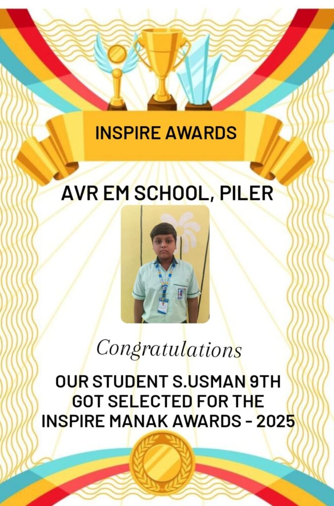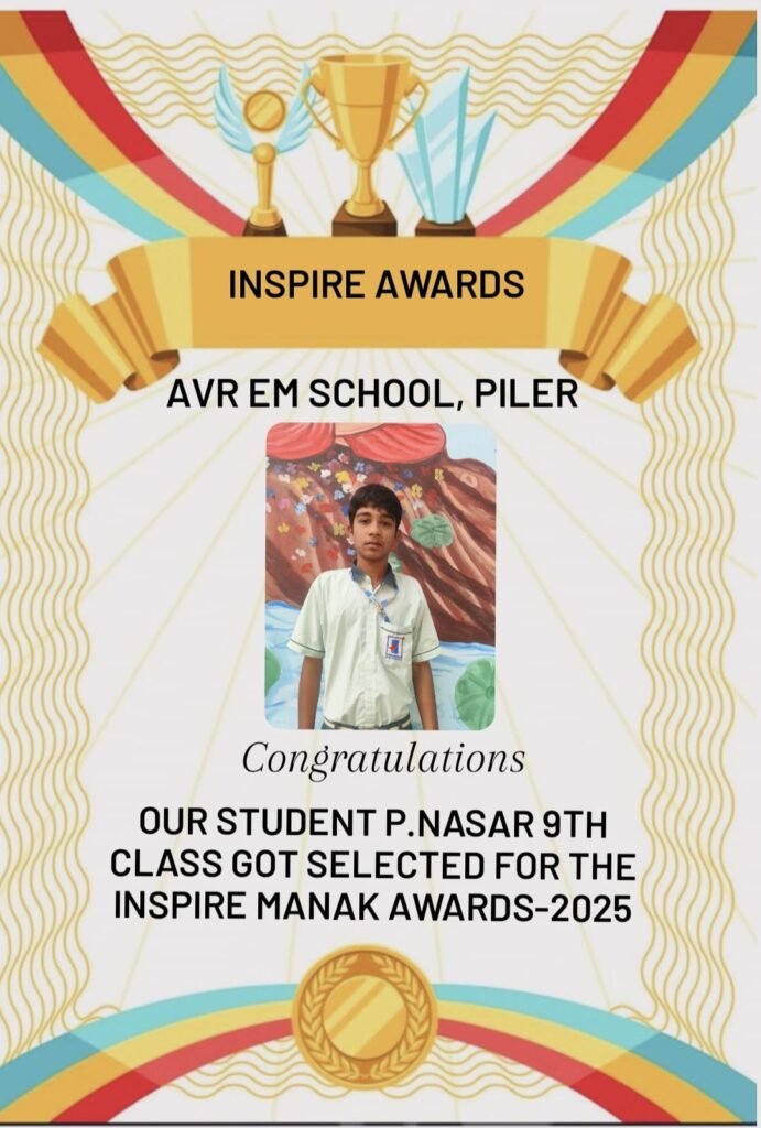 అదేవిధంగా, 9వ తరగతి విద్యార్థులు పి. నాసర్ మరియు ఎస్. ఉస్మాన్ ప్రతిష్టాత్మకమైన INSPIRE MANAK Awards – 2025 కు ఎంపిక కావడం విశేష గౌరవంగా నిలిచింది. INSPIRE (Innovation in Science Pursuit for Inspired Research) MANAK Awards అనేది విద్యార్థుల innovative ideas మరియు creative scientific thinking ను ప్రోత్సహించే ఒక prestigious national-level initiative. వీరు రూపొందించిన వినూత్న ఆలోచనలు (innovative concepts) మరియు సృజనాత్మక ప్రాజెక్టులు (creative projects) జాతీయ స్థాయిలో recognition పొందడం పాఠశాలకు గర్వకారణం.